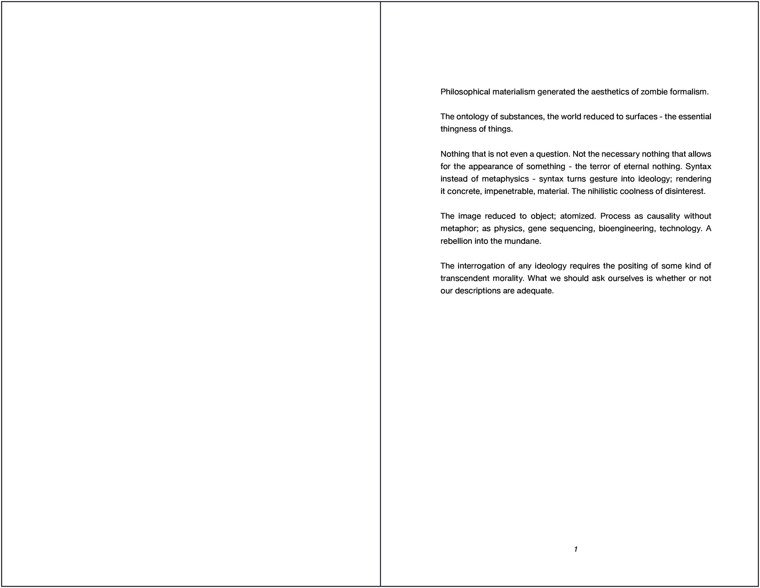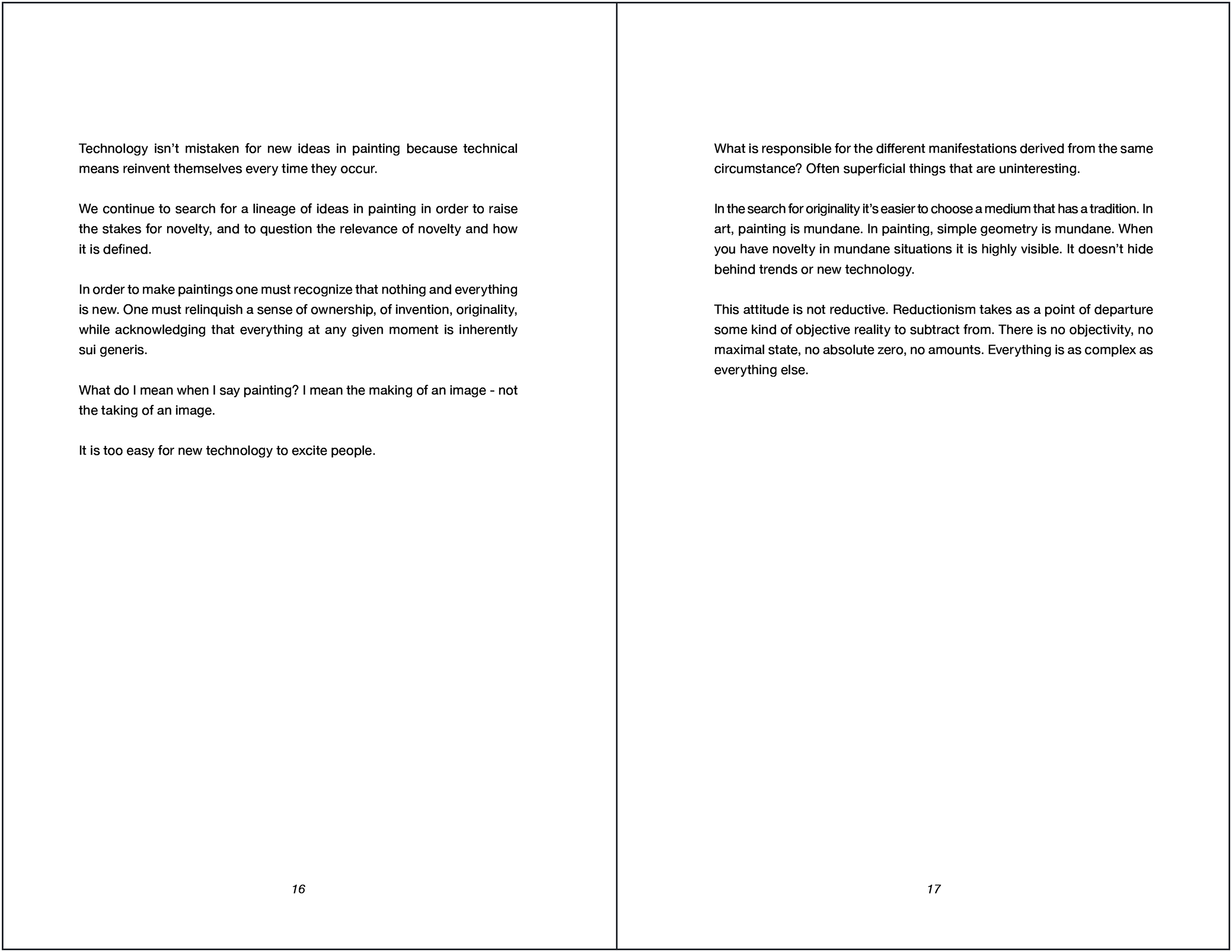 Creating time-based animations in which the composition slowly and imperceptibly shifts serves the dual function of combining a multitude of compositional variants into a single work without the limitations of a static material structure. Over centuries painting evolved historically to occupy different types of spaces. Because digital files exist in a state of infinite multiplicity and can occupy multiple platforms simultaneously, they have the capacity to proliferate beyond traditional market and institutional constraints.